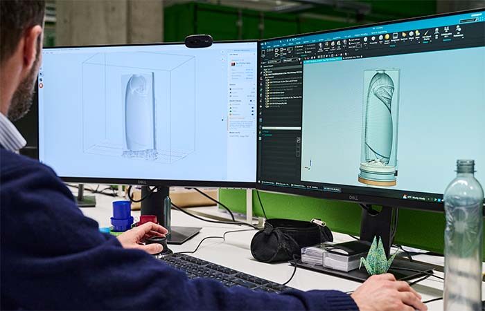 Stefano Cademartiri, responsabile del reparto CAD e prototipazione presso il dipartimento di ricerca e sviluppo di Casalpusterlengo di Unilever, e Flavio Migliarelli, responsabile di design presso il dipartimento di ricerca e sviluppo di Serioplast Global Services, hanno lavorato fianco a fianco per testare l’idoneità degli stampi realizzati in 3D per lo stampaggio per stiramento e soffiaggio di volumi ridotti per accelerare la prototipazione e i test pilota, riducendo i tempi di produzione di sei settimane e i costi del 90%.